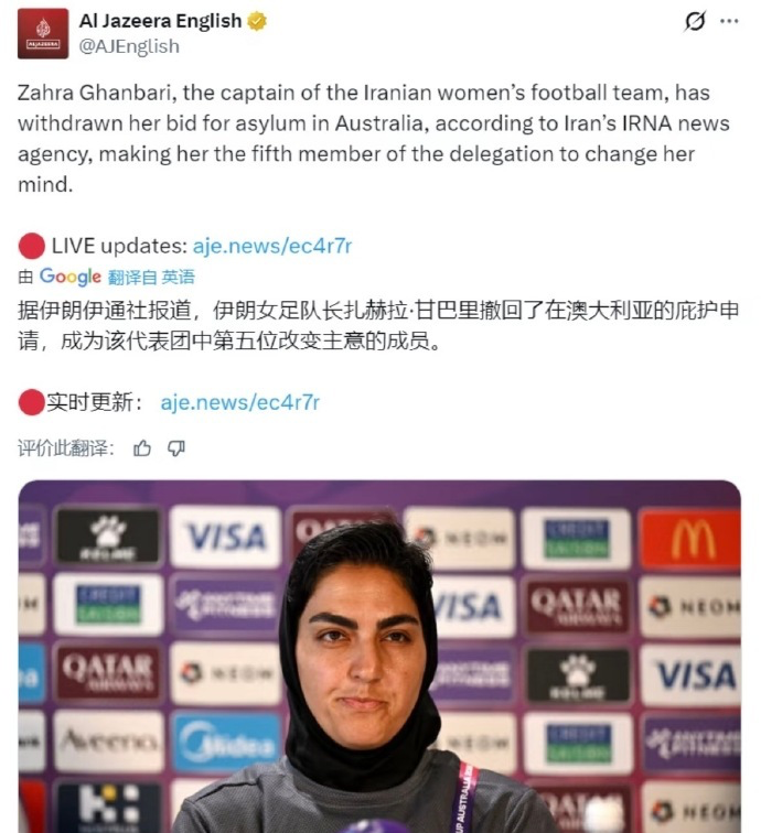 北京时间3月16日,来自伊朗伊通社的最新消息,伊朗女足队长扎赫拉·甘巴里已撤销在澳大利亚的庇护申请,成为代表团中第5名放弃留澳、选择回国的成员。而根据外媒的透露,甘巴里发现家人失踪后做出这样的决定。